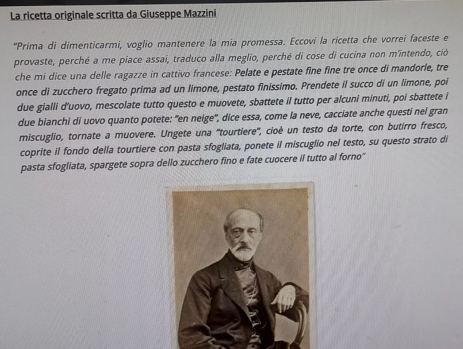 Non me lo sarei mai immaginato: mi fermo con le mie nipoti ,da “Tucca e Leva” spartano e risparmioso,ristorante sulla strada che porta alla chiesa di San Rocco di Camogli,e la proprietaria Carla Barbieri mi propone,per dolce, la Torta di Mazzini.! Si ,proprio Giuseppe Mazzini fervente...